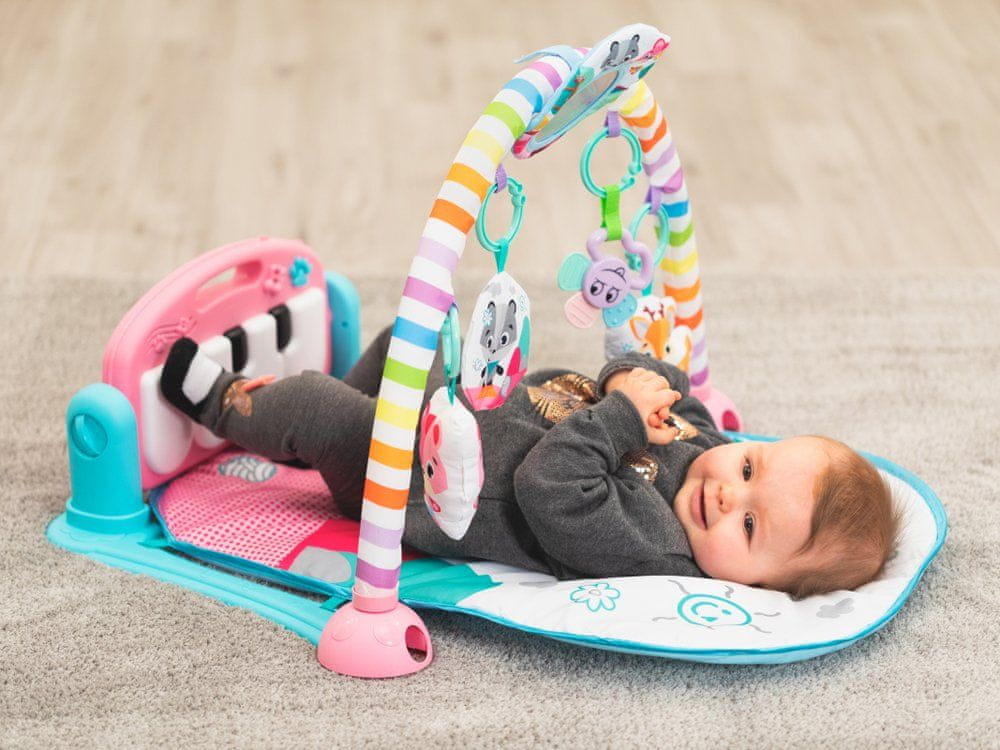 • Območje za vadbo – ko otrok samostojno dvigne glavo, lahko naglavni trak premaknete na sprednji del podloge. Otrok, ki leži na trebuhu, ima igrače na dosegu rok. Ko premikate roke in udarjate po tipkah, boste slišali zvoke klavirja.