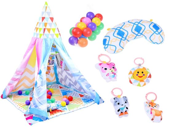 Šotorska podloga v stilu tipi-style je uporabna od prvih dni dojenčkovega življenja. Pisan šotor in mehka podloga v mehkih barvah ima številne možnosti uporabe: lahko nadomesti odejo in prvo hišo. Pritrjene in senzorično stimulativne igrače z grafikami živali spodbujajo prijemanje in vadbo malih rokic. Šotor je precej prostoren, zato lahko vanj zlahka namestimo vse otroške zaklade.