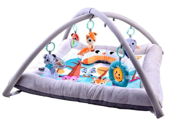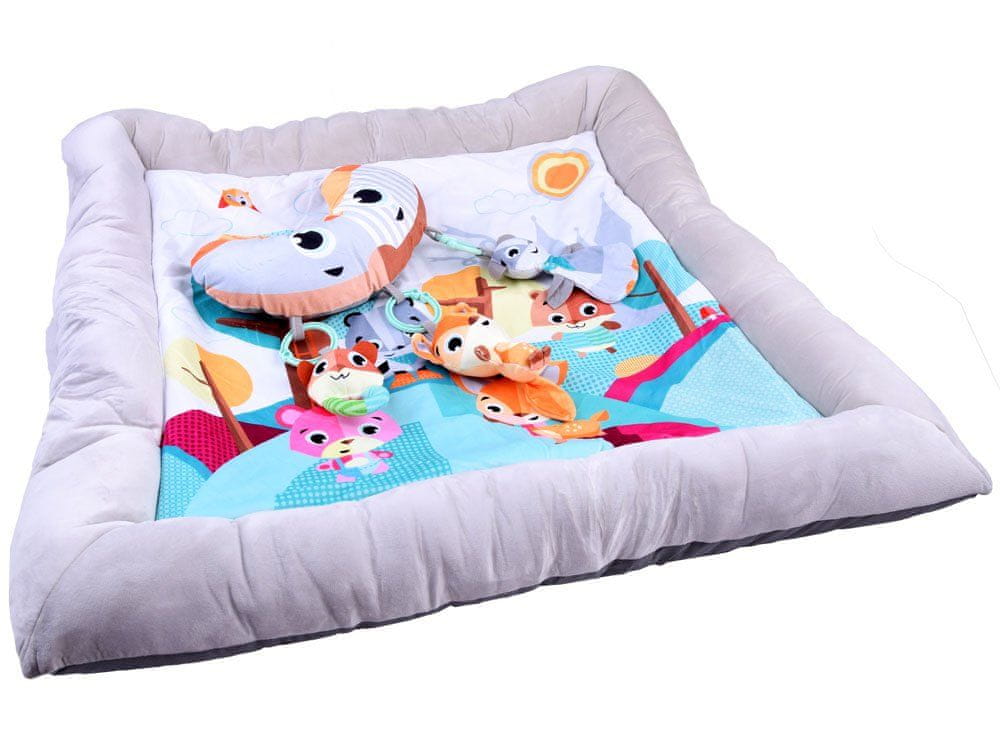 Ljubi, mehka in elegantna izobraževalna podloga za najmlajše bo všeč tako dojenčku kot staršem. Podloga je svetlo sive barve s simpatično kontrastno grafiko. Material je mehak in prijeten na otip. Stranice podloge so napolnjene z mehkim polnilom, ki ščiti vašega malčka med valjanjem po podlogi. Izobraževalna podloga je opremljena z nastavljivimi loki, na katere je mogoče obesiti igrače. Igrače so obešene na plastičnih có³³.