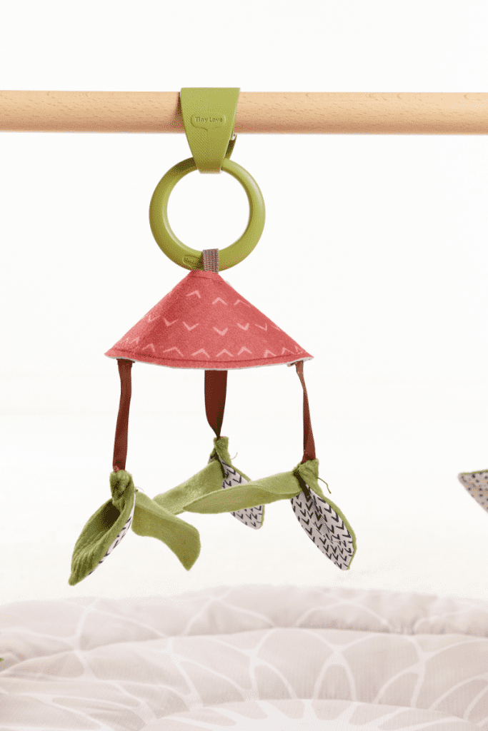 Igralna odeja Tiny Love Boho Chic s trapezom v razkošnem dizajnu z lesenim trapezom ponuja različne dejavnosti za zabavo in spodbujanje otrokovih čutov že od rojstva.