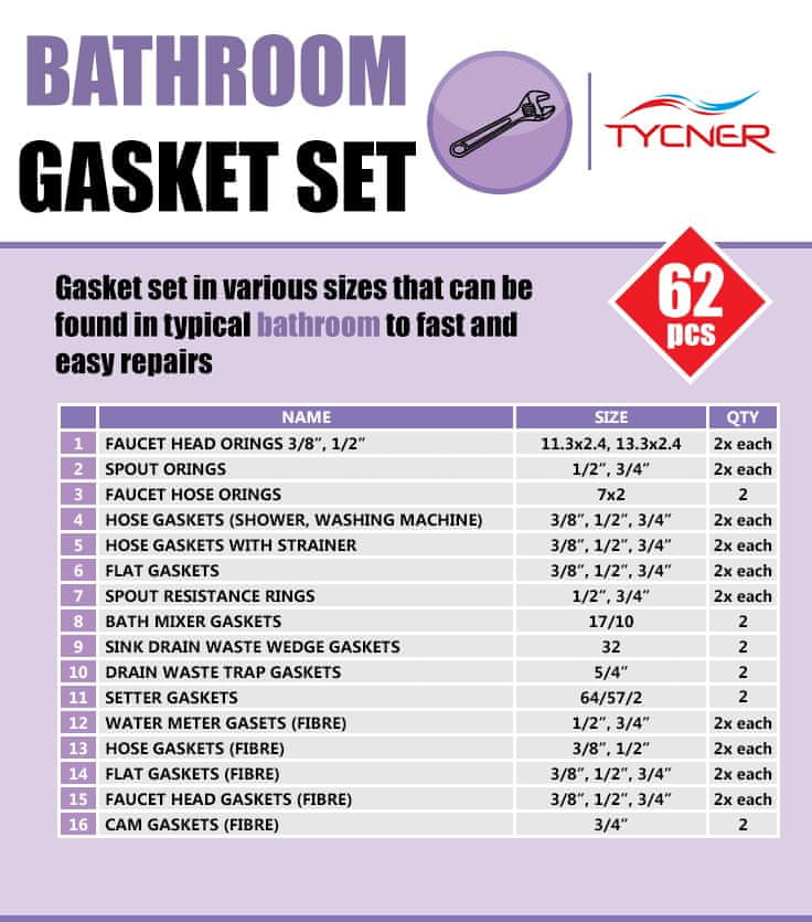 Komplet 62 tesnil različnih velikosti in vrst, ki se lahko uporabljajo v tipičnih kopalnicah; Specifikacije:- Hitra in enostavna popravila;- Material: guma in vlakna.
