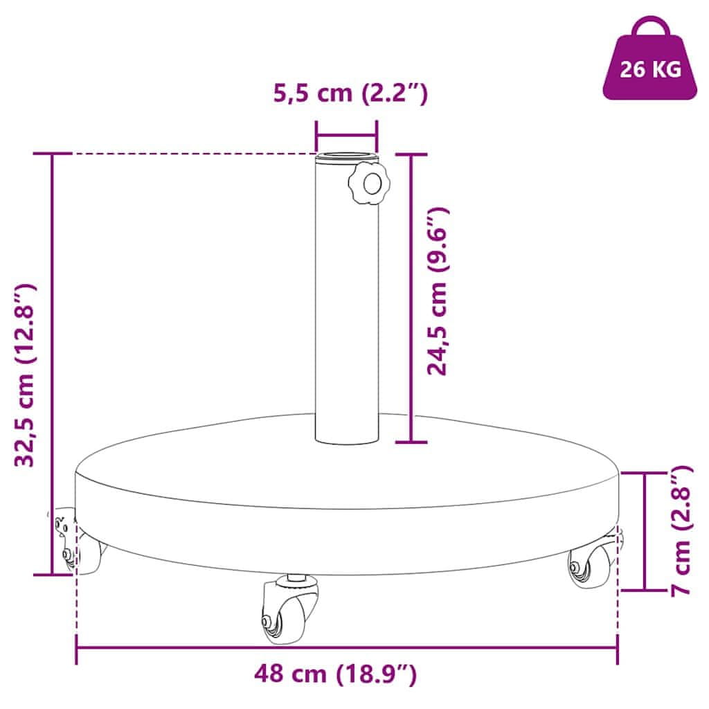 • 1 x osnova za dežnik s koleščki: 48 × 48 × 7 cm (D x Š x V)