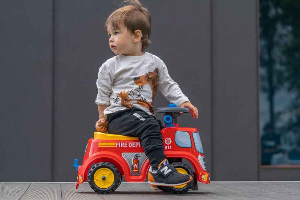 Testirano v skladu z evropskimi standardi – izdelano v Franciji. oblikovanje – gasilski tovornjak s sireno na volanu odpirajoči se sedež Dimenzije: dolžina 55 cm, višina 35 cm, širina 30 cm Višina sedeža: 25 cm nosilnost: do 25 kg Lahko se priključi na stransko prikolico.