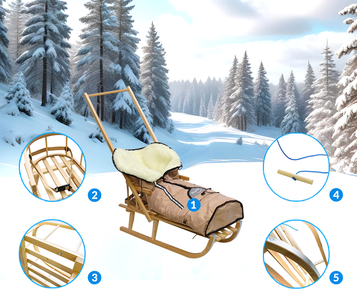 shumee Tradicionalne lesene sani za otroke z naslonjalom, potisnikom in spalno vrečo PL