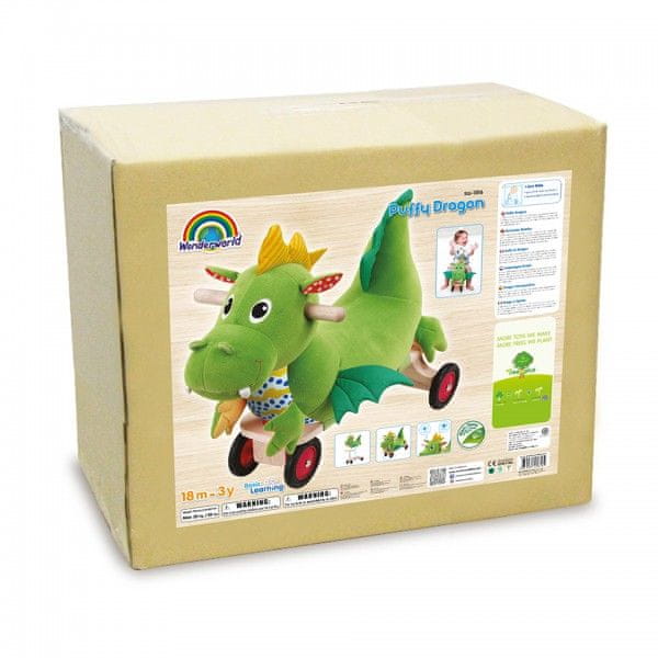 Kdo si ne bi želel jahati kosmatega zmaja in v njegovem sedlu odkrivati svet pravljic in domišljije? Skuter je krmiljen, z odstranljivim delom iz blaga. Kot plišasto žival lahko otrok zmaja vzame s seboj, kamorkoli gre. Njegova ušesa in glavnik izdajajo različne zvoke, šumijo in piskajo ter tako spodbujajo sluh in dotik. Robustna in trpežna lesena konstrukcija vozička je opremljena z gumiranimi kolesi, ki zagotavljajo tiho vožnjo po različnih vrstah površin. Izdelek je treba sestaviti, priložena so slikovna navodila za sestavljanje. Glavne značilnosti:vgrajene različne zvočne atrakcijetiha vožnja z zmogljivostjo največ 25 kgtrdna lesena konstrukcija