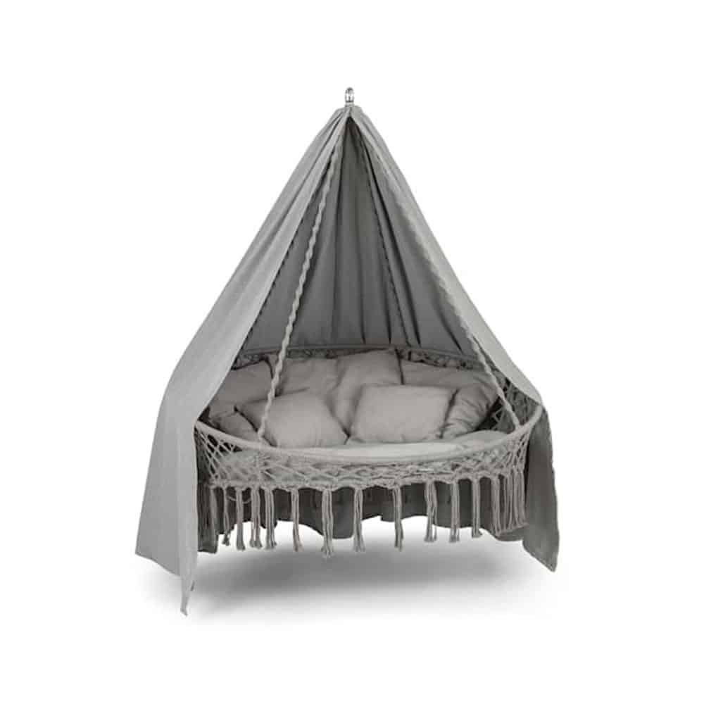 Izdelan iz močnih, UV odpornih poliestrskih vlaken, je ta naslonjač zasnovan tako, da zdrži vsakodnevno uporabo in ohranja svojo estetiko skozi čas. Kljub svoji velikosti pa ostaja izredno stabilen z nosilnostjo do 300 kg, kar omogoča udobno sproščanje za dve osebi. Nežen gib, ki ga nudi viseči naslonjač, vas bo zazibal v miren spanec ali sproščujoče popoldne.