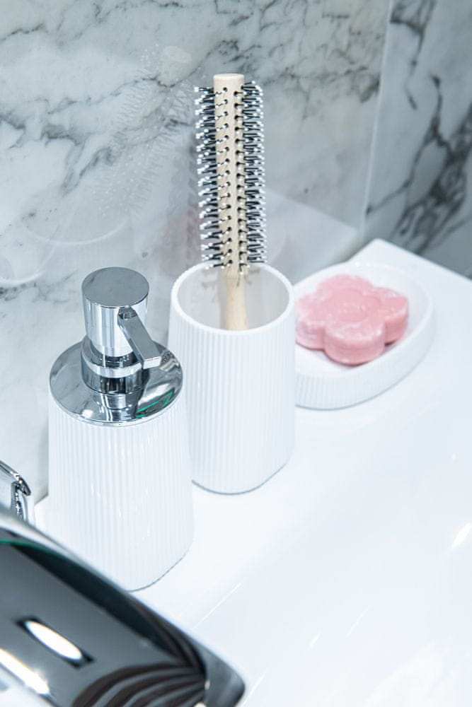 Minimalistična kopalniška skodelica iz serije ZEN znamke AWD Interior v beli barvi. Preprosta oblika se odlično dopolnjuje z moderno in skandinavsko notranjostjo, medtem ko rebrasta tekstura izboljša oprijem in je udobna za vsakodnevno uporabo. Skodelica se odlično obnese kot posoda za zobne ščetke, zobno pasto ali majhne dodatke, saj pomaga ohranjati red pri umivalniku. Izdelana je iz ABS-a, zato je lahka in enostavna za čiščenje. Serija ZEN – čista oblika in minimalizem Kopalniška skodelica – za zobne ščetke in majhne predmete Bela – univerzalna za vsako kopalnico Material: ABS – lahka in praktična Dimenzije: 7 × 7 × 11,5 cm – kompaktna za pult Tehnične informacije o izdelku Blagovna znamka AWD Interior EAN 5901812358646 Koda izdelka AWD02191512 Serija Zen Širina [cm] 7 Globina [cm] 7 Višina [cm] 11,5 Neto teža [kg] 0,2 Glavni material: ABS Barva: bela