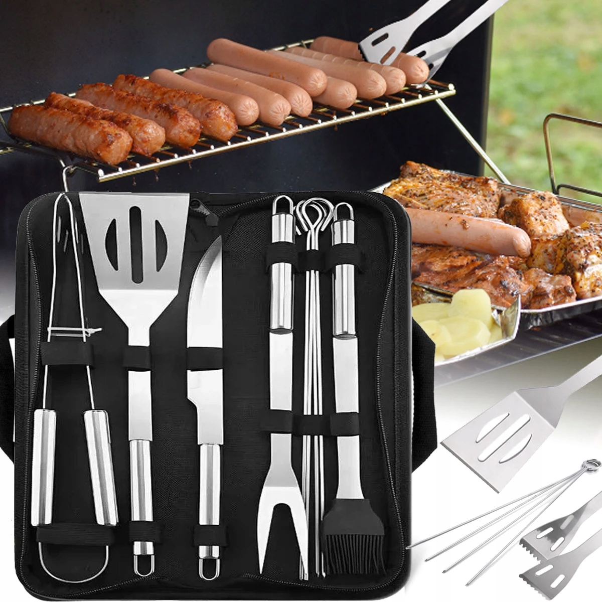 Komplet vsebuje vse, kar potrebujete za delo na žaru: nož, vilice, lopatico, čopič, klešče in nabodala za nabodala in etui za shranjevanje.