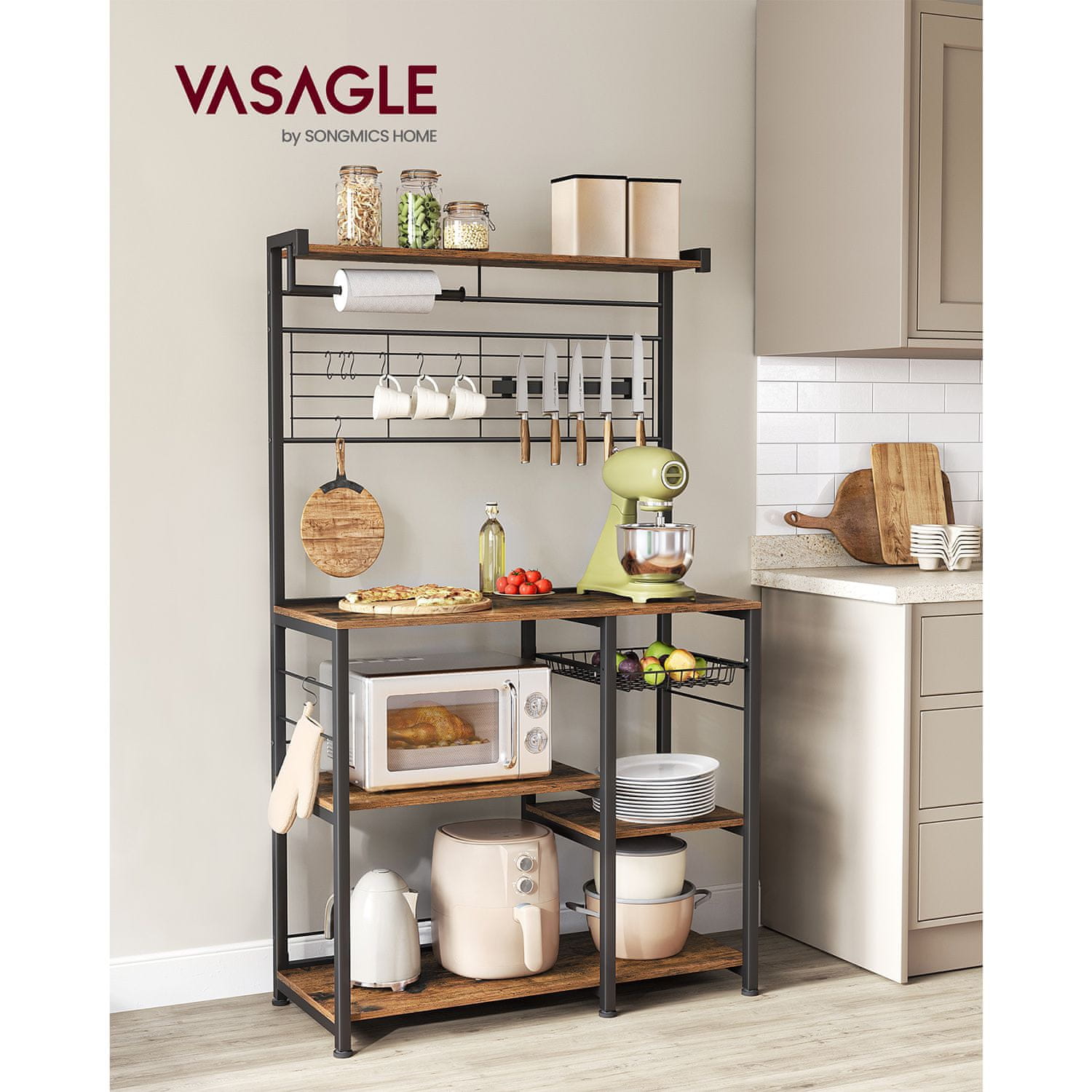Ta vsestranska kuhinjska polična enota je zasnovana za zagotavljanje obsežnega shranjevanja in organizacije vaših kuhinjskih pripomočkov. Vsebuje več polic žično košaro magnetni trak za nože in kljuke kar je idealno za ohranjanje vašega delovnega prostora urejenega in učinkovitega. Trdna konstrukcija in praktična razporeditev jo naredijo primerno za uporabo kot podaljšek kuhinjskega otoka delovno površino ali regal za shranjevanje.
