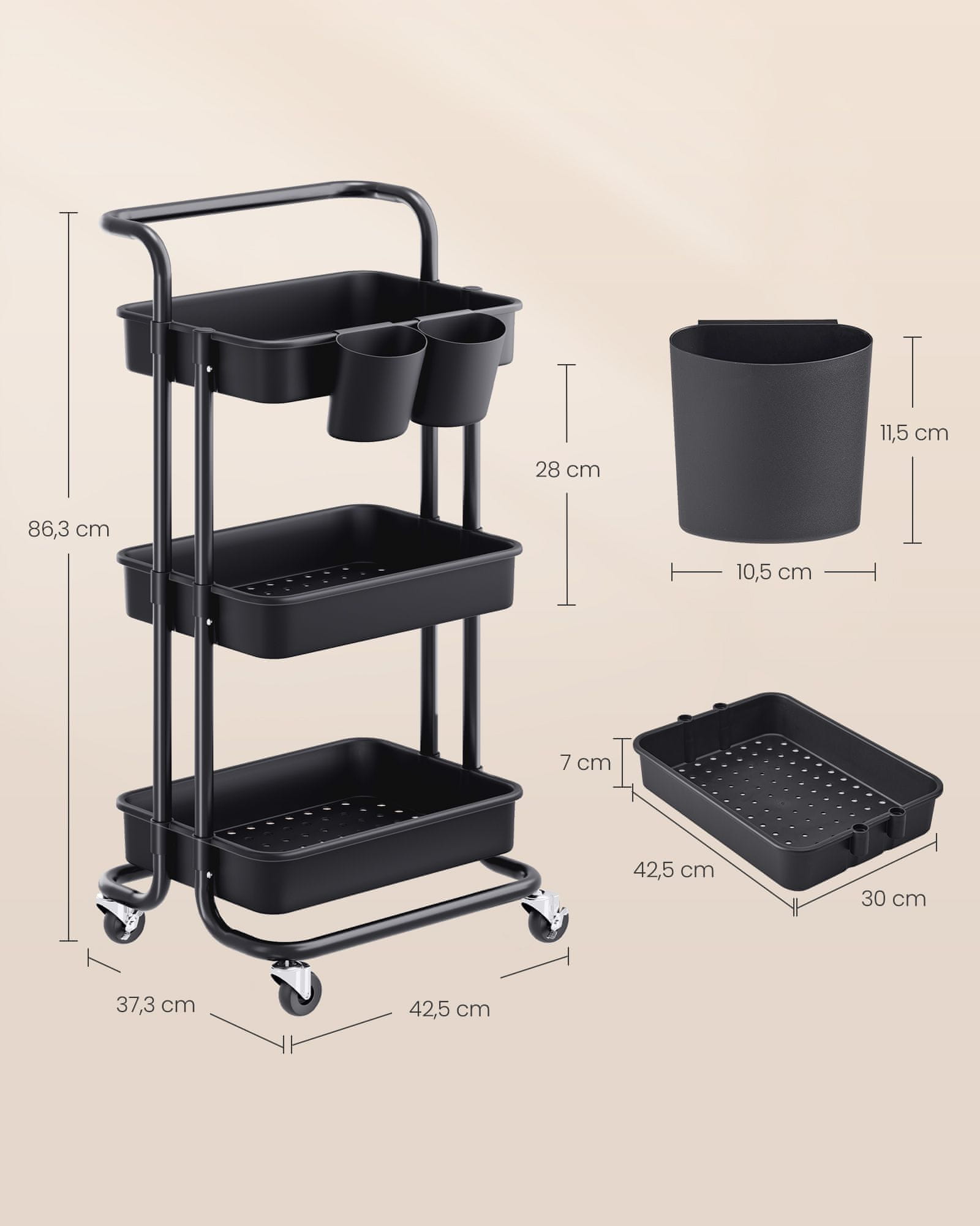 Songmics Voziček na kolesih 3-nadstropni večnamenski voziček 416x335x863 cm črn