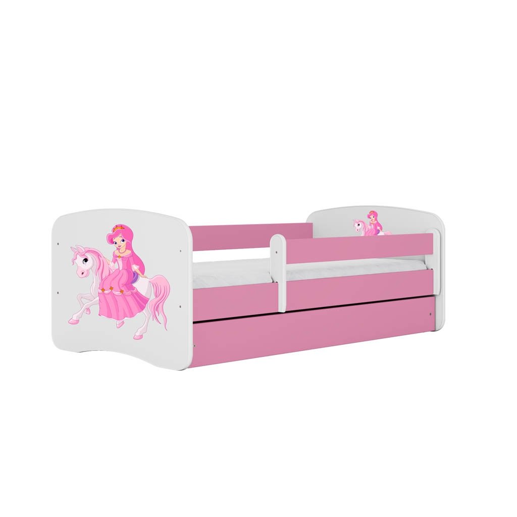 Opremite otroško sobo z varno, kvalitetno in moderno otroško posteljo s prikupnim motivom princeske na konju, ki bo popestrila otroško sobico in bo v veselje vsaki deklici! Postelja je na voljo v treh različnih barvah in poleg posteljnega okvirja vsebuje še posteljni pod, penasto ležišče, varnostno ograjico ter priročni podposteljni predal v katerega lahko pospravite posteljnino, igrače in podobne malenkosti.