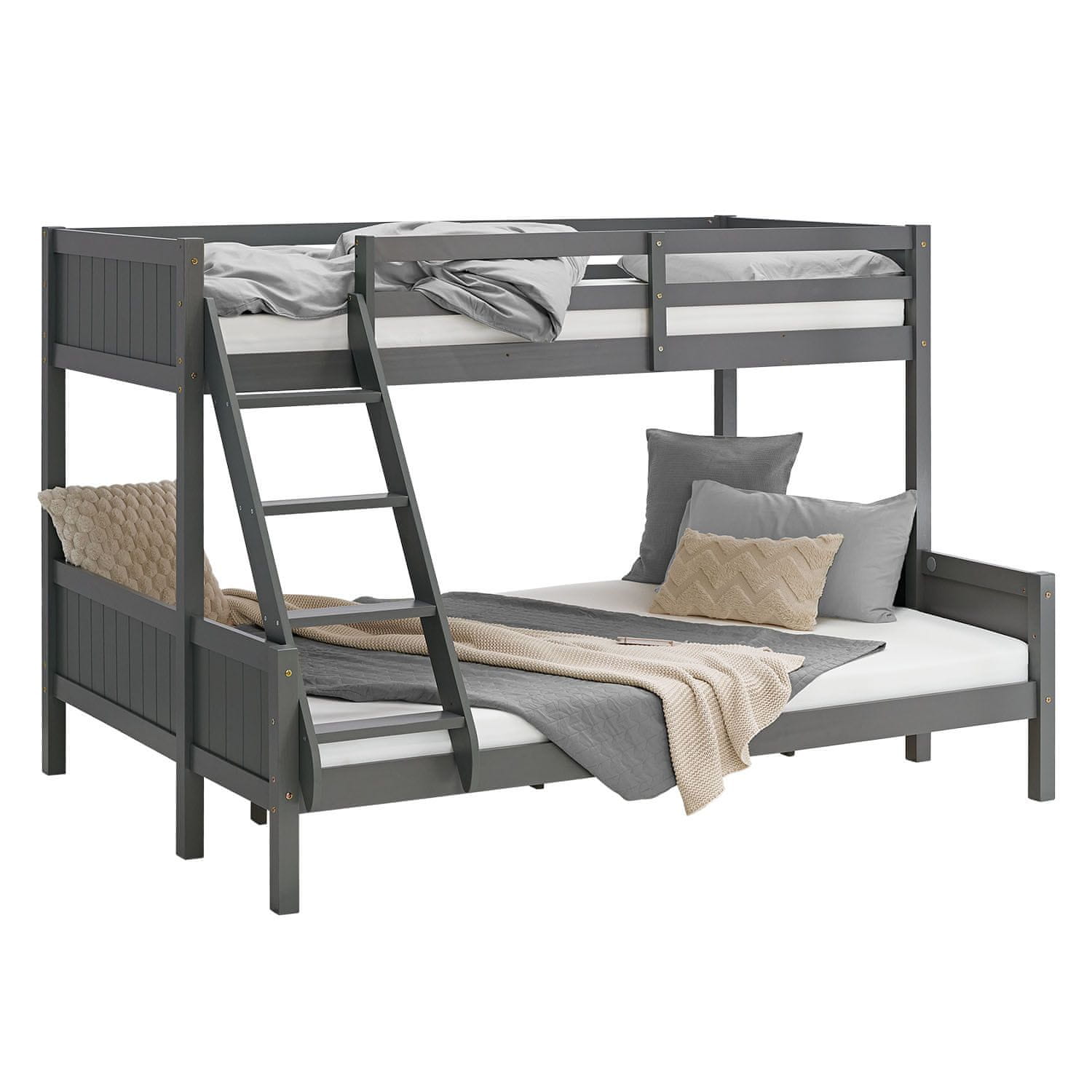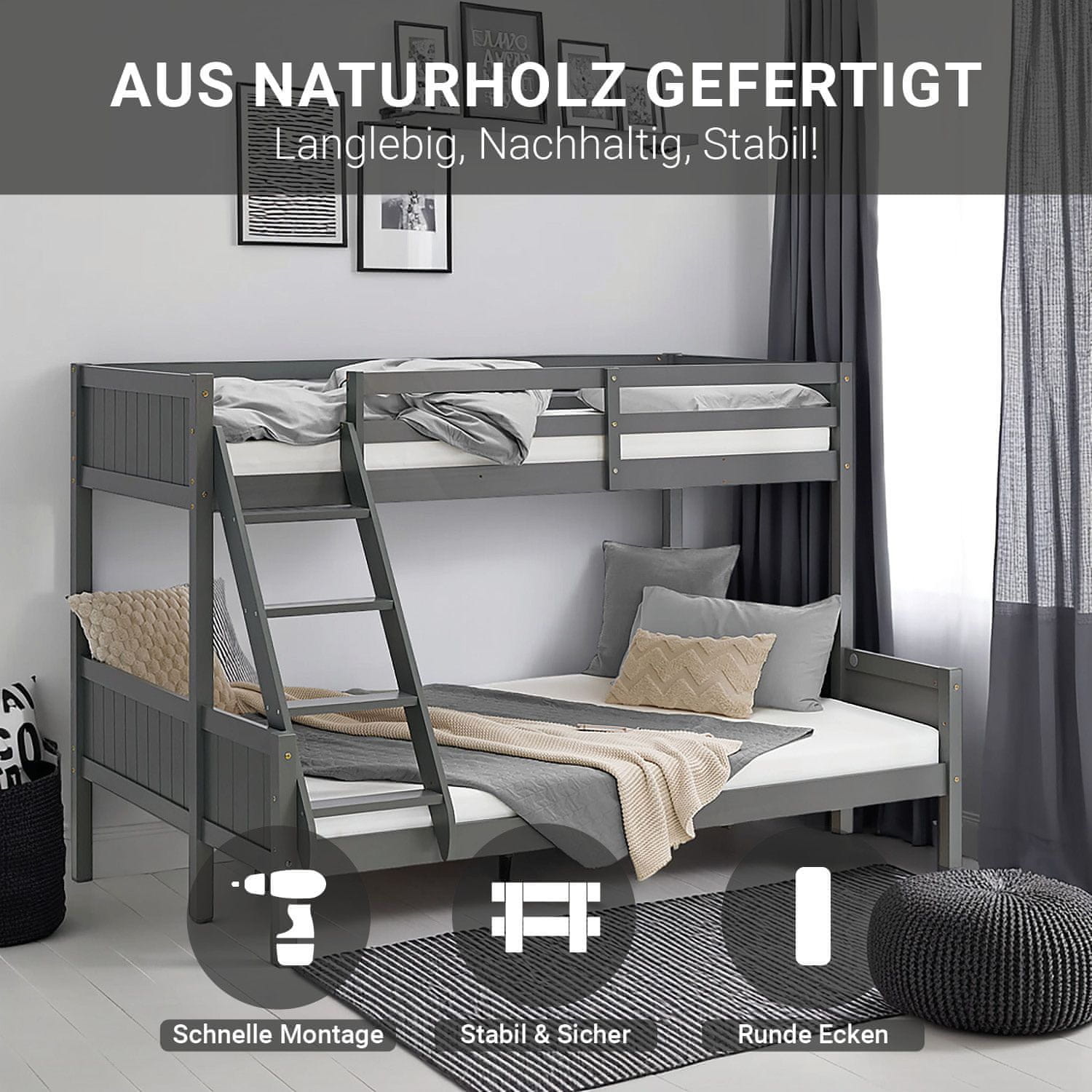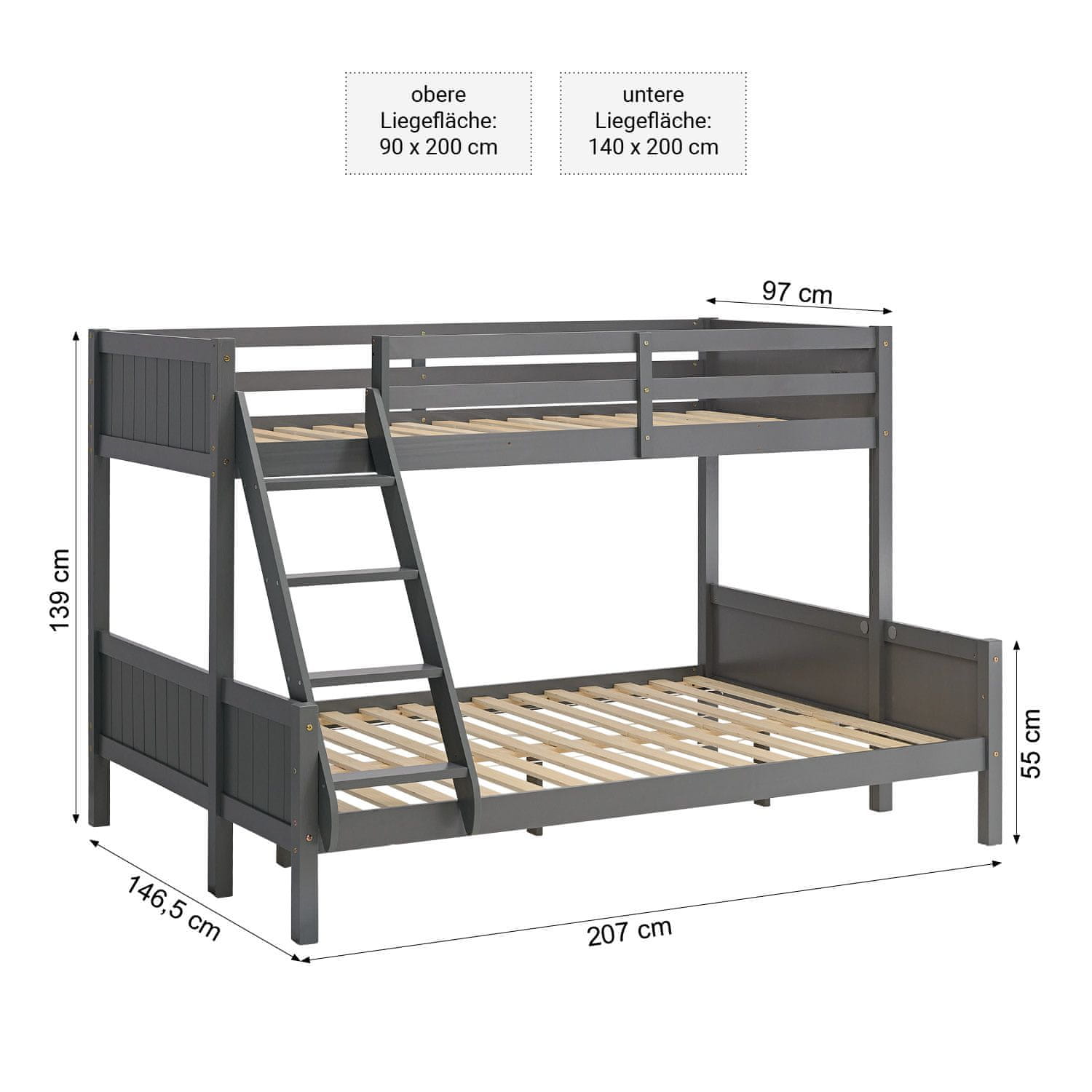 Ta vsestranska pograd je zasnovana za maksimizacijo spalnega prostora v otroških ali mladinskih sobah, zato je idealna za družine z več otroki ali za goste. Z dvema različno velikima ležiščema in trdno konstrukcijo iz borovega lesa nudi udobje in varnost. Sodobna siva barva in premišljene podrobnosti, kot so varnostni rob zgornjega ležišča in prilagodljiva postavitev lestve, zagotavljajo, da se pograd brezhibno prilega različnim postavitvam prostora. Barva (odtenek): Siva, Dolžina (cm): 207, Višina (cm): 139, Globina / širina (cm): 146,5, Material (podrobno): Les, plošča – Les, Velikost postelje: 140 × 200 cm, S shrambo ali brez: Brez shrambe, Namenjeno za: Otrok, Število mest: 2 ležišči, S posteljnim dnom ali brez: Brez posteljnega dna, Vrsta lesa: Bor, Zgornje ležišče: 90 × 200 cm, Spodnje ležišče: 140 × 200 cm, Zunanje dimenzije (ŠxVxG): 207 × 139 × 146,5 cm, Višina prostora pod posteljo: 21 cm, Globina vstavitve vzmetnice: 4 cm, Debelina stebra: 50 mm, Posteljni okvir in letvena dna iz masivnega borovega lesa, Lestev je mogoče namestiti na desno ali levo stran s 3 ravnimi masivnimi stopnicami, Stabilna konstrukcija z masivnimi posteljnimi stebri, Zaobljeni robovi in stebri, Varnostni rob zgoraj (zaščita pred padcem), Vzglavje in vznožje z navpičnimi utori