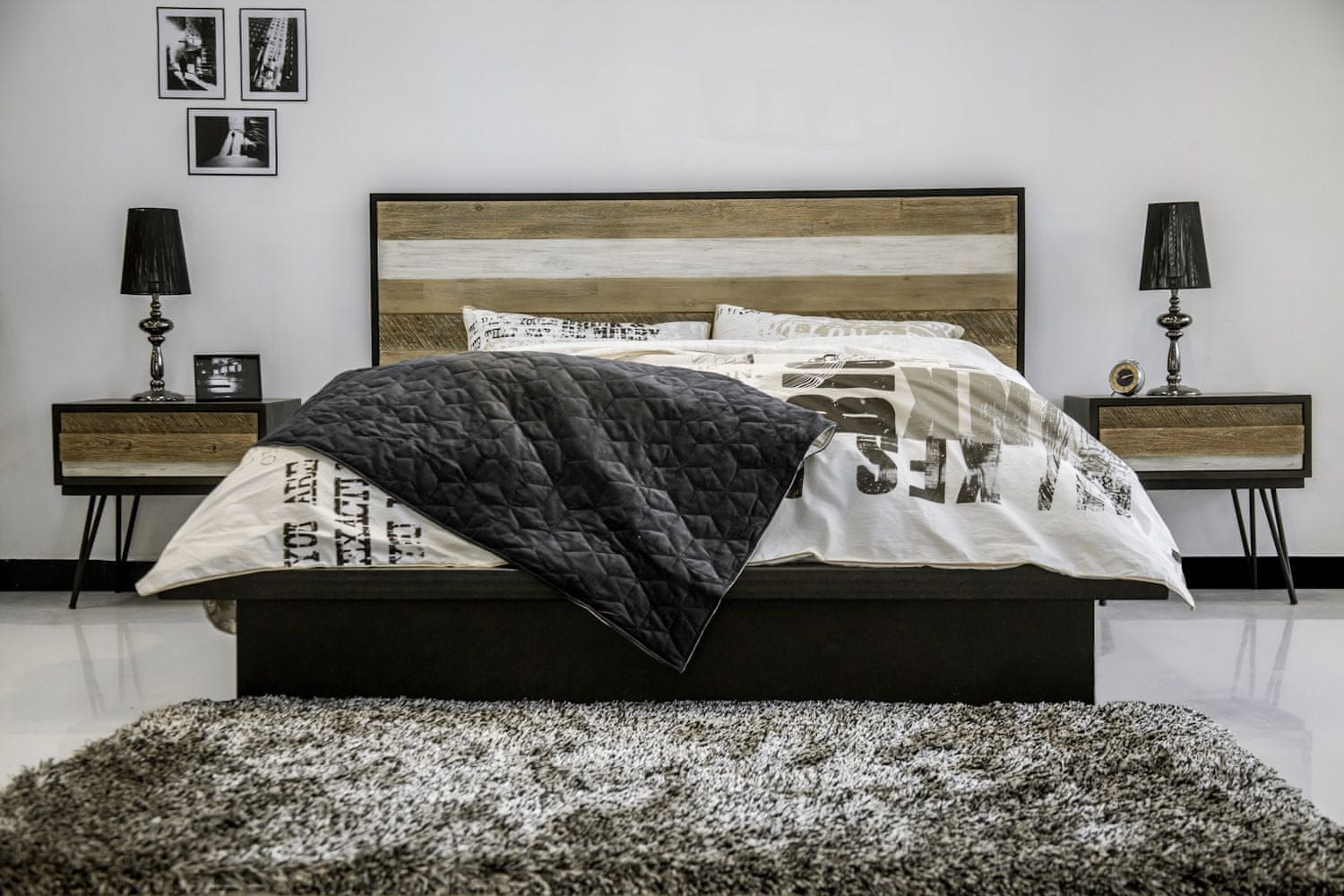 Adesso ADESK01, retro postelja, visokokakovostni brušen masiven eksotični akacijev les, MDF okvir, kovinske noge, vzglavje z raznoliko teksturo v različnih odtenkih, brez letvenega dna in vzmetnice, barva: črna, odtenki sive in bež, črne noge, delno sestavljena, teža: 51 kg, dimenzije (Š x V x G): 187 × 125 × 219 cm, vrsta lesa: akacija, material (podrobno): les, plošča – les, ležišče: 180 × 200 cm, namenjeno za: odrasle, število mest: 2