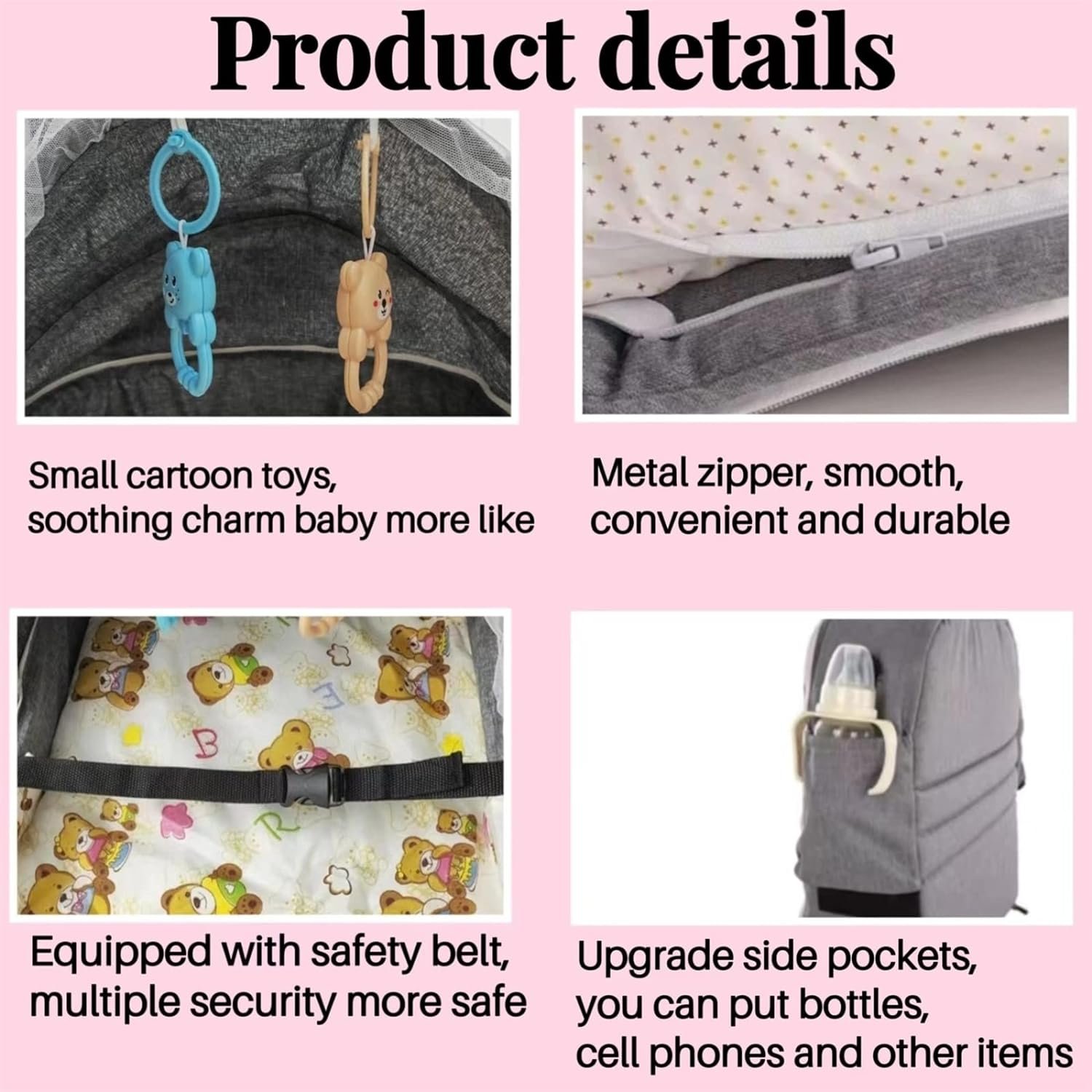 K nahrbtniku so dodane tudi zanke za igrače, ki jih lahko uporabljate za zabavo dojenčka. Te ne samo spodbujajo vid in otip otroka, ampak mu tudi nudijo veselje in zaposlitev med potovanjem.