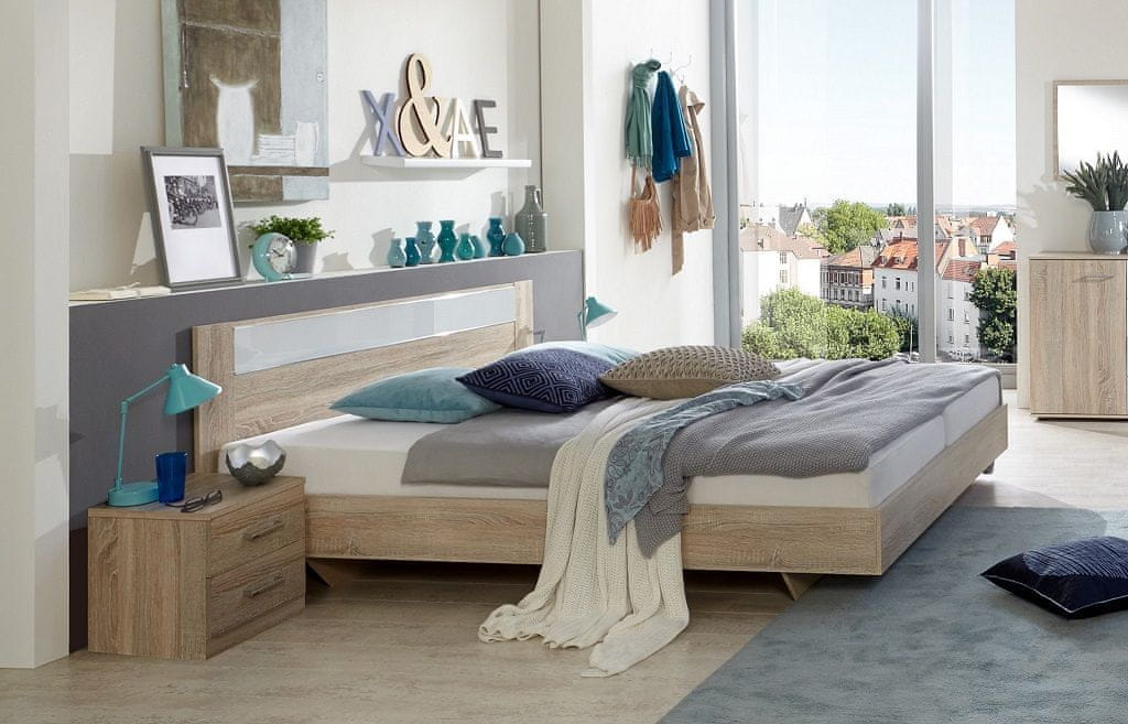 Elegantna postelja PAMELA v kombinaciji sonoma hrast barve z belim steklom in kromiranimi dodatki, ki ustvarjajo svetel in prijeten videz vaše spalnice. Postelja je zasnovana za vzmetnico dimenzij 140 × 200 cm.