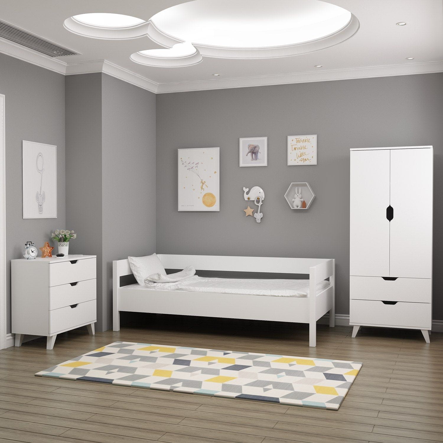 100 % MELAMINSKO PREVLEČENA IVERNA PLOŠČA Debelina: 18 mm Enoposteljna posteljna garnitura: Širina: 100 cm Višina: 200 cm Globina: 69 cm Garderobna omara: Širina: 72 cm Višina: 176 cm Globina: 47 cm Komoda: Širina: 72 cm Višina: 76 cm Globina: 40 cm Številne police
