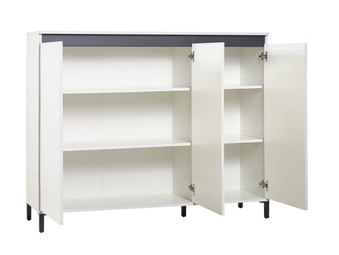 S širino 138 cm in 3 vrati brez ročajev ponuja omara dovolj prostora za organiziranje in shranjevanje različnih stvari. Sijajni beli zaključek dodaja okolju svetlost, antracitni (ali beli) okrasni vložek pa daje pohištvu pridih prefinjenosti.