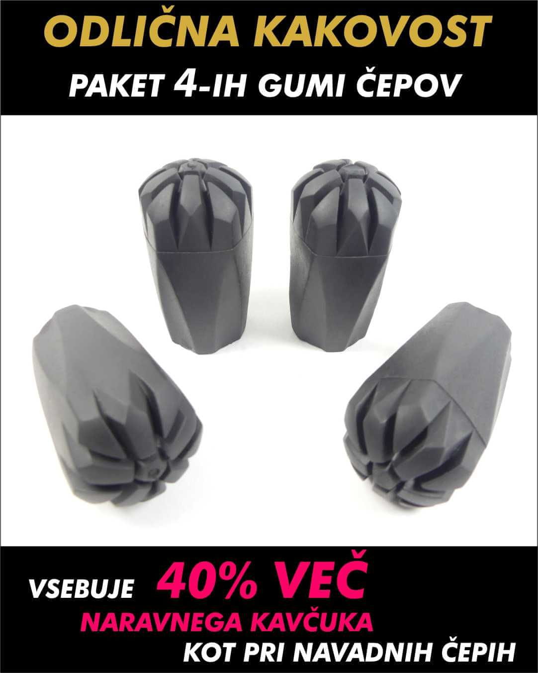 • paket 4 gumijastih čepov z 11-milimetrskim premerom za namestitev na vse standardno oblikovane pohodne palice;