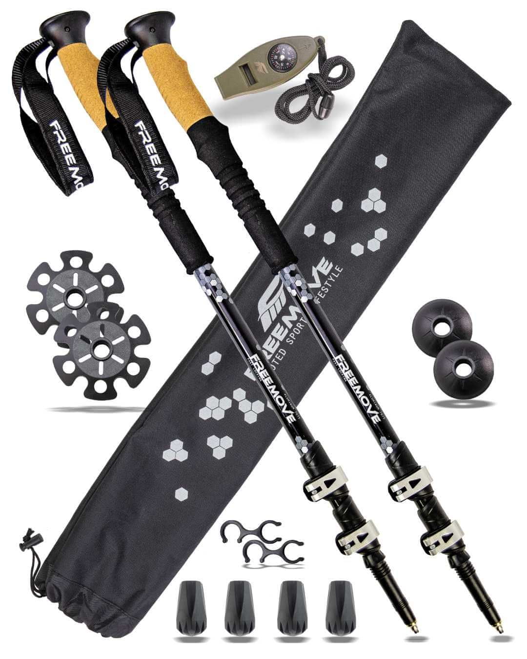 FREEMOVE Pohodne treking palice - srebrne, aluminij 7075, teleskopske 3-delne , dol. 63-135 cm, quick-lock zapiranje, naravni plutast ročaj / podaljšan, karbidne konice, torba za prenašanje, DARILO - piščalka