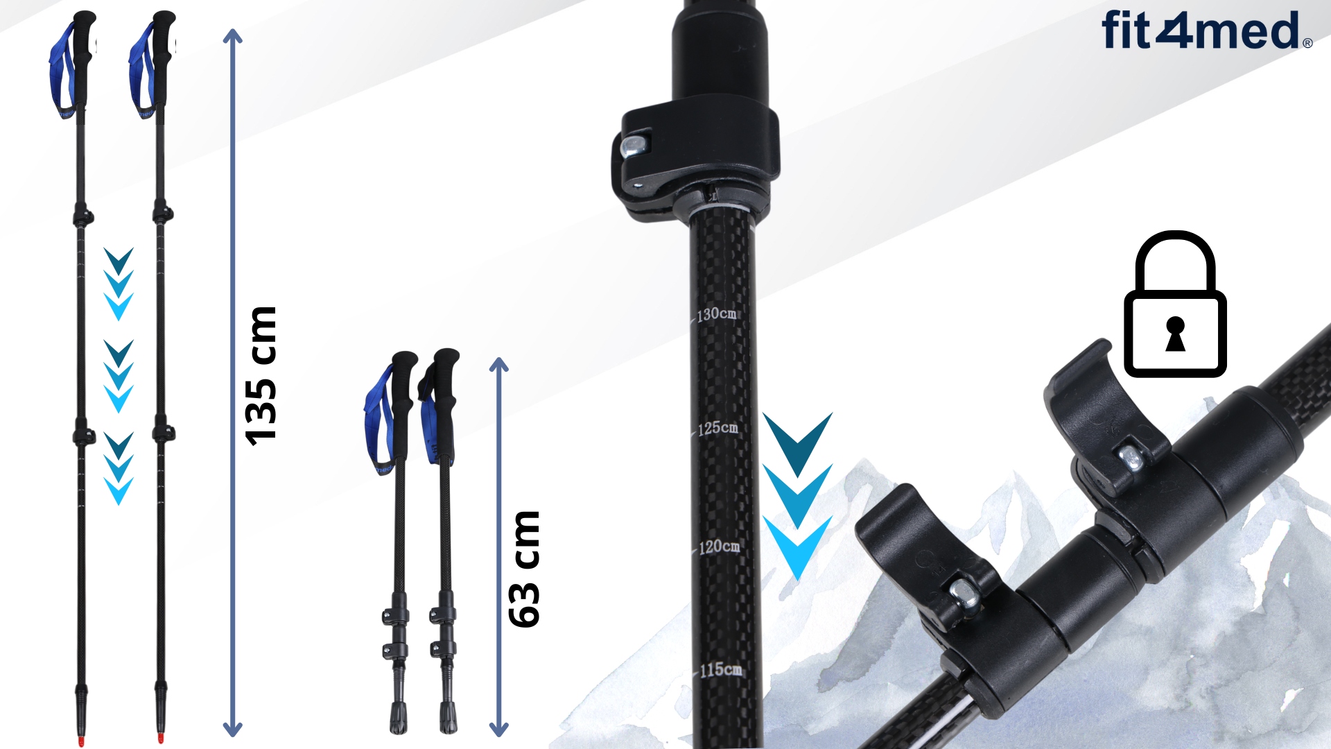 • ✅Nastavitev dolžine – Pohodniške palice omogočajo nastavitev dolžine od 63 cm do 135 cm, kar omogoča enostavno prilagoditev individualnim potrebam uporabnika in terenskim razmeram. Palice imajo jasno lestvico, ki prikazuje dolžino v centimetrih in palcih, kar omogoča enostavno natančno nastavitev. Ta funkcija vam omogoča hitro in priročno nastavitev palic ter zagotavlja optimalno oporo med pohodništvom.
