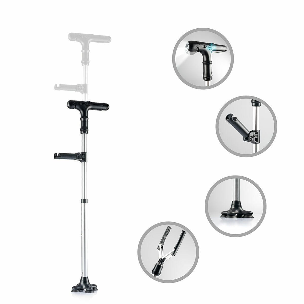 • Stabilnost in varnost : ta večnamenska sprehajalna palica je zelo stabilna in varna. Zagotavlja trden oprijem, saj ima nedrsečo gumijasto nogo s 4 opornimi točkami. Poleg tega ga je mogoče dvigniti s preprostim gibom noge, ne da bi se morali skloniti.