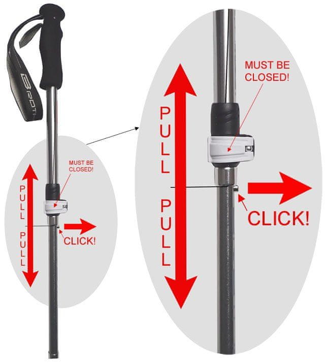 Posebne pohodne palice z nastavljivo višino 115–135 cm, nedrsečim ročajem z mehko prevleko iz mikrovlaken in fiksnim trakom z nastavljivo dolžino. Celoten opis