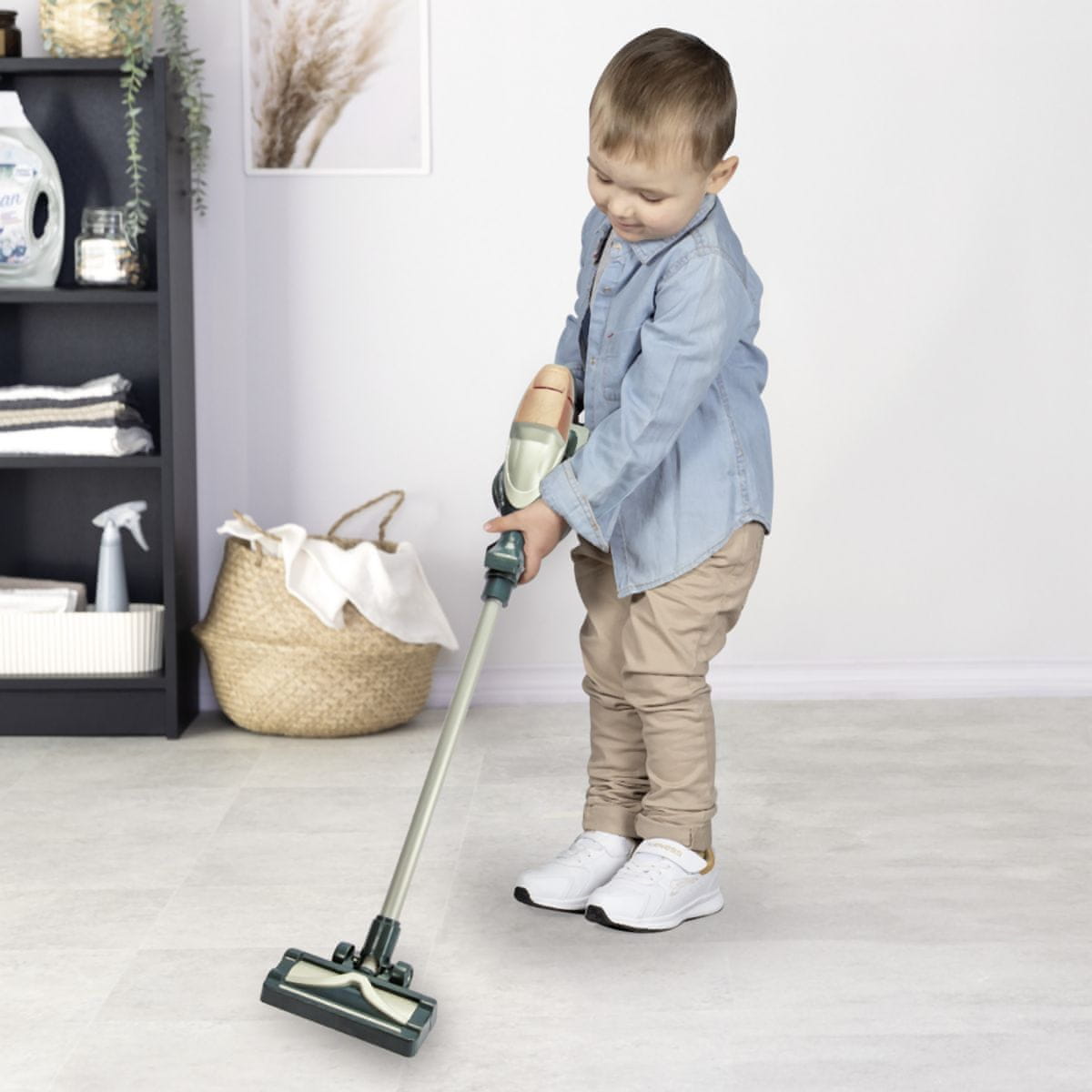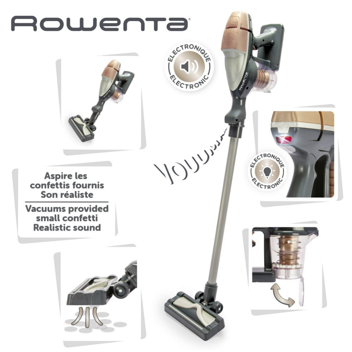Moderni palični sesalnik za otroke v izvirni zasnovi Rowenta Air Force 360°. S pritiskom na gumb lahko sesalnik vklopite, prižge se lučka LED in zaslišite pravi zvok sesanja. Hkrati se aktivira funkcija nežnega sesanja in majhne kroglice v zbiralni posodi se zavrtijo. Posodo lahko tudi odprete in izpraznite, tako kot pravo posodo. Sesalnik Rowenta brez dolgega ročaja lahko otroci uporabljajo tudi kot ročni sesalnik. Dimenzije izdelka (DxŠxV): 8 × 16 × 80 cm.