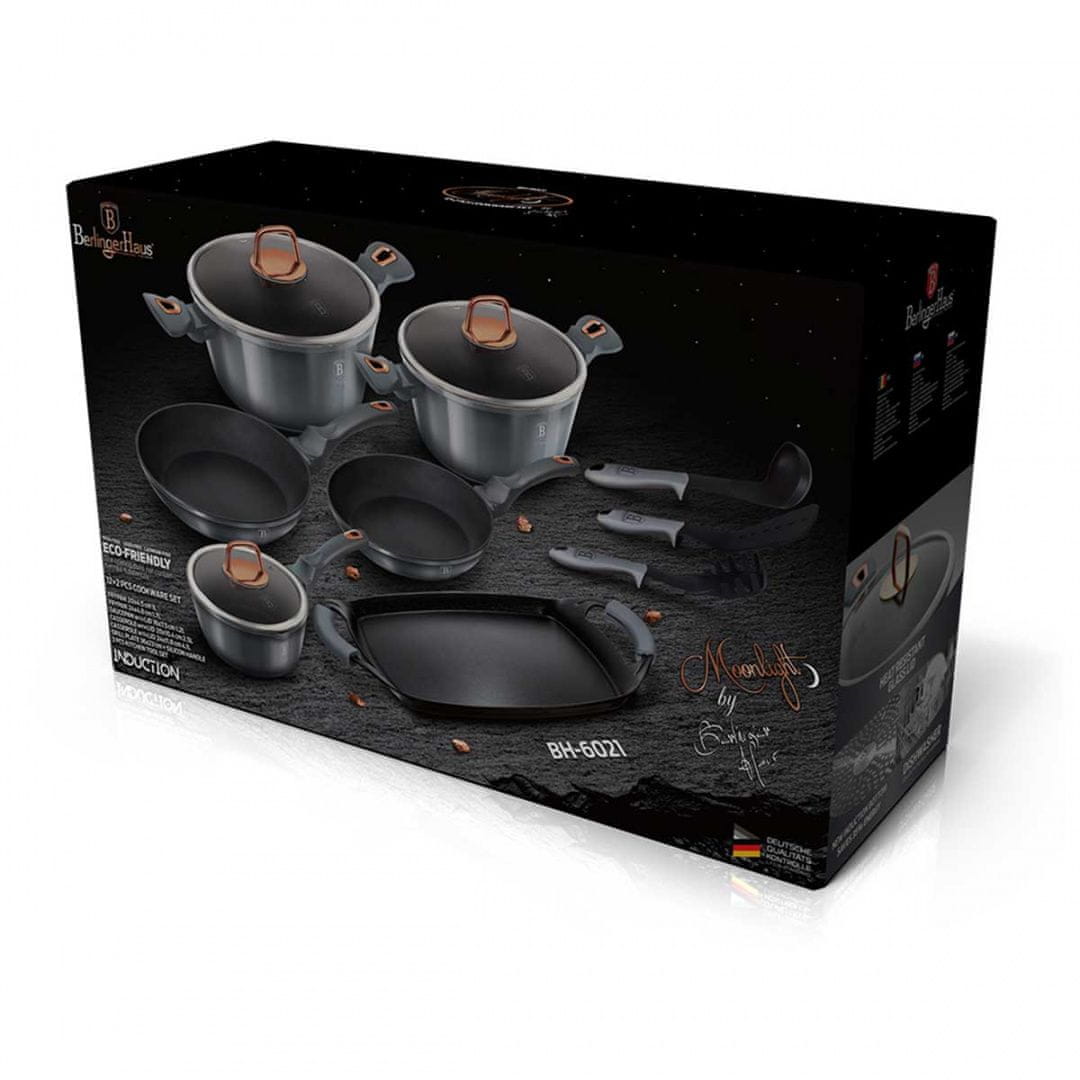 Lonci in ponve serije BERLINGERHAUS METALLIC so izdelani iz visokokakovostnega kovanega aluminija, ki je znotraj pokrit s trojno granitno prevleko (marmor) z zelo visokim koeficientom trdote. Zunanji premaz je na voljo v več barvnih različicah z značilnim kovinskim sijajem. Te privlačne in modne jedi so standardno opremljene s SOFT TOUCH (silikonskim ročajem). Primerno za vse vrste štedilnikov: plinski, električni, keramični, halogenski, indukcijski. Sistem TURBO INDUCTION (segrejejo se zelo hitro) omogoča prihranek do 35% energije.   Vključeno : lonec s pokrovom Ø20 × 10cm ( 2.5L ) lonec s pokrovom Ø24 × 12cm ( 4,5L ) ponev s pokrovom Ø16 × 7,5 cm ( 1,7 L ) ponev Ø22 × 4,5cm ponev Ø24 × 4,8cm pladenj za žar 36×23cm komplet kuhinjskih pripomočkov (3 kos) Značilnosti : Trojni granitni premaz, ki se ne drži Material: visokokakovostni litin iz aluminija Soft-Touch Ročaj: silikonski ročaji Sistem TURBO INDUCTION (zelo hitro se segreje) 35% prihranek energije Primerno za pomivalni stroj Za vse vrste štedilnikov: plinski, električni, keramični, halogenski, indukcijski Barva: Moonlight   Granitna prevleka je teflonska prevleka, obogatena z granitnimi drobci, zahvaljujoč kateri doseže večjo trdoto. Je težji od teflona, hkrati pa ohranja svoje prednosti: ne gori, dobro porazdeli toploto. Združuje prednosti litega železa in teflonske posode. Ima vse prednosti teflona, vendar je bolj odporen proti poškodbam in prekaša celo keramične prevleke.   Granitna prevleka naredi posode izjemno odporne na praske in trpežne. Ta vrsta loncev omogoča tudi cvrtje z minimalno količino maščobe, ker se posoda segreje kot kamen in odda toploto na celotni površini.   Sestava aluminijastega telesa in feromagnetnega dna omogoča uporabo na indukcijskem štedilniku in vseh drugih vrstah kuhinj ter najboljše akuturne lastnosti litega in kovanega aluminija na vseh štedilnikih in kuhalnih ploščah.