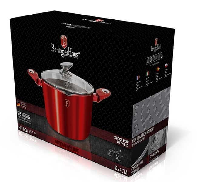 Lonci in dodatki serije BERLINGER HAUS METALLIC so izdelani iz visokokakovostnega kovanega aluminija s trojno granitno prevleko (marmor) znotraj z zelo visokim koeficientom trdote. Zunanji premaz je na voljo v več barvnih različicah z značilnim kovinskim sijajem. Te privlačne in modne jedi so standardno opremljene s SOFT TOUCH (silikonskim ročajem). Primerno za vse vrste štedilnikov: plinski, električni, keramični, halogenski, indukcijski. Sistem TURBO INDUCTION (segrejejo se zelo hitro) omogoča prihranek do 35% energije. Mere : Lonec Ø24 × 13,5 cm (5,5 L) Steklen pokrov z zračnikom. Pokrov s posebnim perforiranim ovratnikom za lažje odvajanje vode iz kuhanih testenin, krompirja ali riža. Značilnosti : Trojna granitna prevleka proti lepljenju Material: visokokakovostni litin iz aluminija Soft-Touch Ročaj: silikonski ročaji Sistem TURBO INDUCTION (segrejejo se zelo hitro) 35% prihranek energije Primerno za pomivalni stroj Za vse vrste štedilnikov: plinski, električni, keramični, halogenski, indukcijski Barva: RDEČA (BURGUNDY) Granitna prevleka je teflonska prevleka, obogatena z granitnimi drobci, zahvaljujoč kateri doseže večjo trdoto. Je težji od teflona, a hkrati ohranja svoje prednosti: ne gori, dobro porazdeli toploto. Združuje prednosti litega železa in teflonske posode. Ima vse prednosti teflona, vendar je bolj odporen proti poškodbam in prekaša celo keramične prevleke. Granitna prevleka naredi posode izjemno odporne na praske in trpežne. Ta vrsta loncev omogoča tudi cvrtje z minimalno količino maščobe, ker se posoda segreje kot kamen in odda toploto na celotni površini. Sestava aluminijastega telesa in feromagnetnega dna omogoča uporabo na indukcijskem štedilniku in vseh drugih vrstah kuhinj ter najboljše akuturne lastnosti litega in kovanega aluminija na vseh štedilnikih in kuhalnih ploščah.