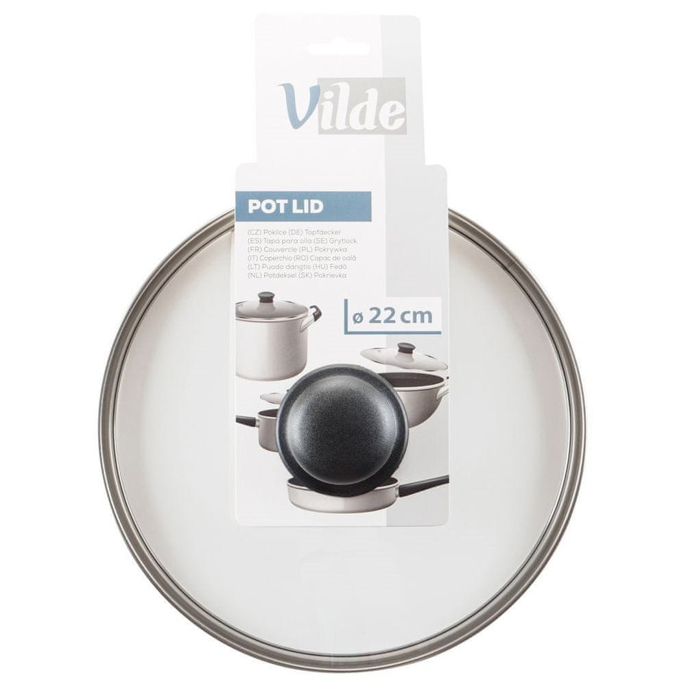 Univerzalni stekleni pokrov, idealen za lonce, ponve in cvrtje s premerom 22 cm. Izdelan je iz trpežnih in trdnih materialov. Odličen dodatek k vsakemu loncu ali ponvi, ki še nima pokrova. Klasična oblika zagotavlja udobno uporabo. Pokrov je bistvenega pomena v vsaki kuhinji. Pomaga, da se hrana hitreje kuha in ščiti pred brizganjem. Poleg tega pokrov pomaga, da hrana ostane dlje topla. Originalni izdelek Vilde. Izdelano v skladu z evropskimi standardi.