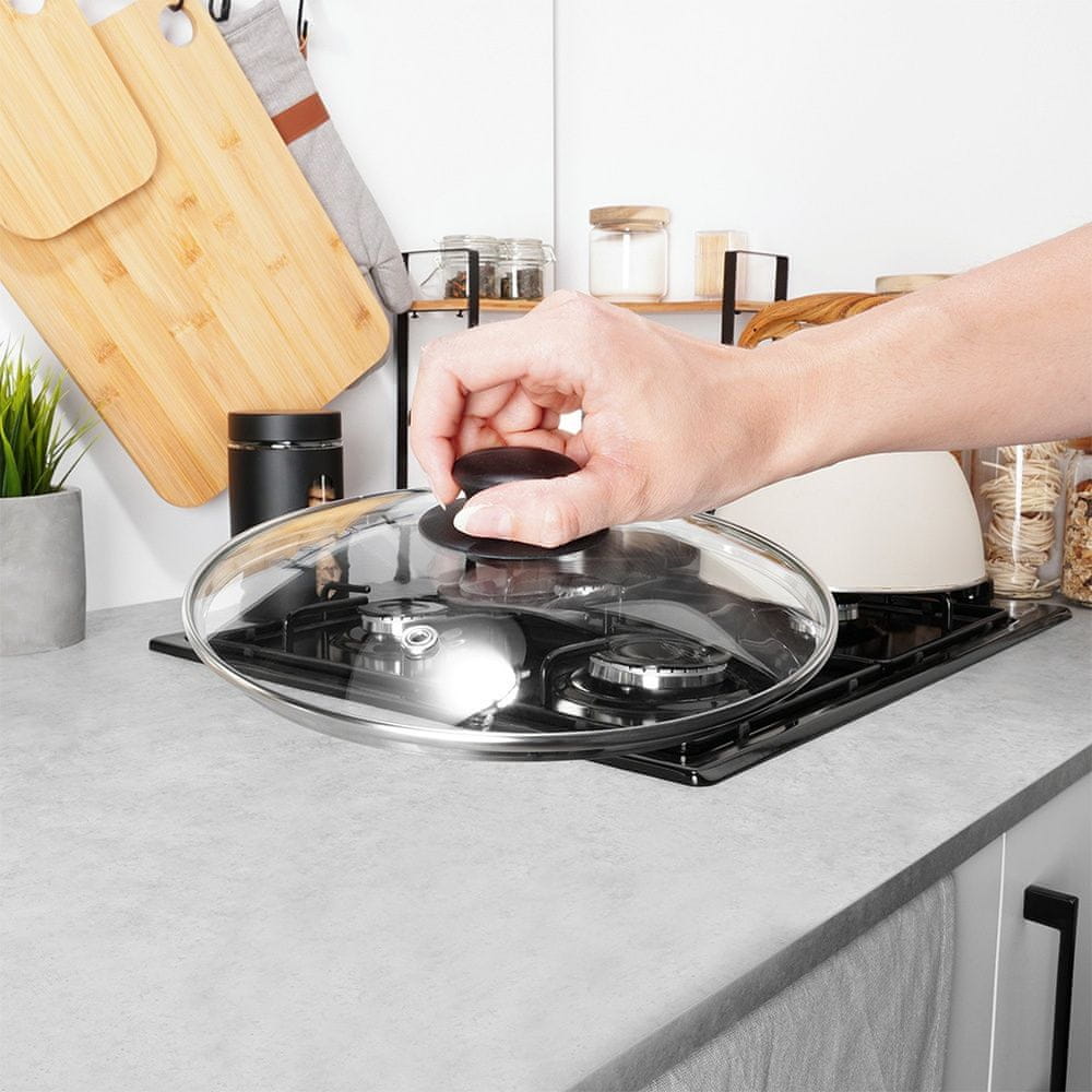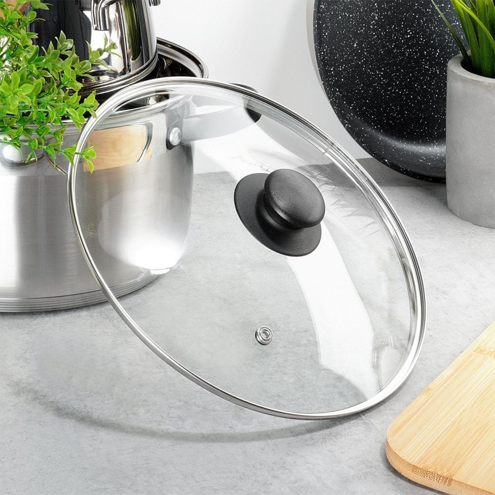 Univerzalni stekleni pokrov, idealen za lonce, ponve in cvrtje s premerom 24 cm. Izdelan je iz trpežnih in trdnih materialov. Odličen dodatek k vsakemu loncu ali ponvi, ki še nima pokrova. Klasična oblika zagotavlja udobno uporabo. Pokrov je bistvenega pomena v vsaki kuhinji. Pomaga, da se hrana hitreje kuha in ščiti pred brizganjem. Poleg tega pokrov pomaga, da hrana ostane dlje topla. Originalni izdelek Vilde. Izdelano v skladu z evropskimi standardi.
