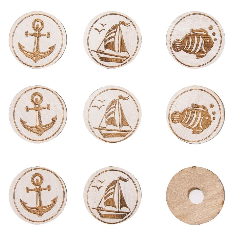 Set z 9 okroglimi lesenimi ploščicami, premer 3,5 cm, z lepljivo piko, 3× ladja z jadri, 3× sidro, 3× riba. Motivi so naneseni z laserjem in ne natisnjeni. Naravna temna barva motiva/okvirja je v lepem kontrastu s svetlimi lesenimi podlagami. Celoten opis