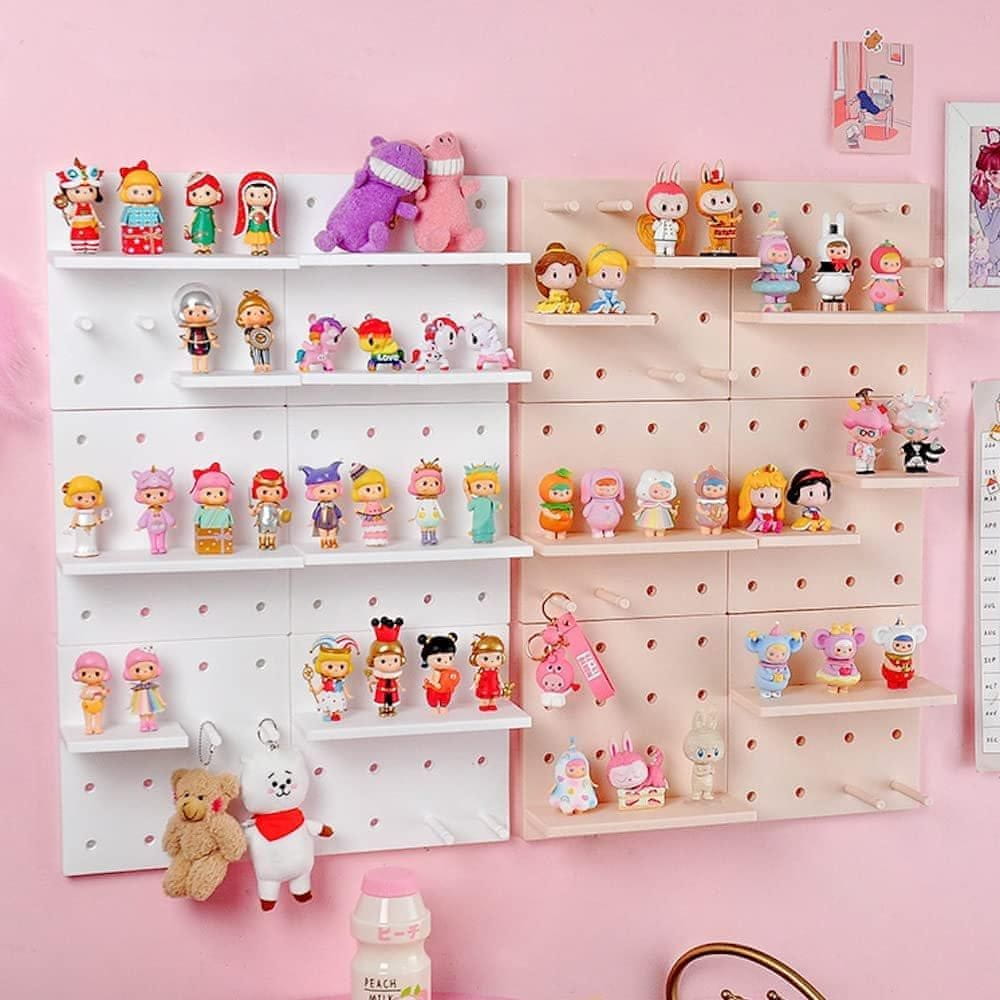 Ta edinstvena polica za shranjevanje se prav tako dobro prilega tako spalnici kot kopalnici in kuhinji! Polica je tako edinstvena, da jo izdelate sami in da lahko njen dizajn prilagodite svojim željam. V tem kompletu dobite ploščo z luknjami, ki se pritrdijo najbližje steni, zatiči, ki se pritrdijo na luknje in nekaj polic, ki jih lahko namestite na vrh zatičev.