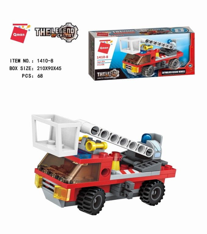 Qman Savior Fv 1410 set 8v1 Gasilski oddelek po vašem okusu. Zgradite gasilski avto, letalo, hidroplan ali jih združite vse skupaj. Izdelano iz nestrupene ABS plastike, 571 kosov v pakiranju. Komplet vključuje: – gasilski avto, gasilsko vozilo, gasilsko vozilo, gasilsko vozilo, gasilsko vozilo: 1× 1410–1 Čoln (vsebuje 79 kosov) 1× 1410–2 Gasilsko vozilo Hurricane (vsebuje 77 kosov) 1× 1410–3 Gasilsko vozilo z lestvijo (vsebuje 57 kosov) 1× 1410–4 Gasilsko ultralahko letalo (vsebuje 59 kosov) 1× 1410–5 Rhinoceros Tank (vsebuje 98 kosov) 1× 1410–6 Reševalno vozilo (vsebuje 67 kosov) 1× 1410–7 Fantomsko štirikolesje (vsebuje 66 kosov) 1× 1410–8 Reševalno vozilo Skywalker (vsebuje 68 kosov)