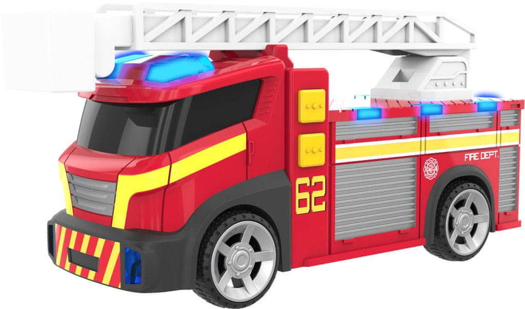 Gasilski tovornjak s svetlobnimi in zvočnimi učinki. Velikost 16 cm. Vključene so baterije 3×AG13. Celoten opis