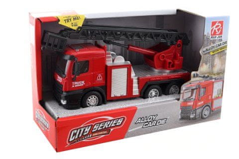Avtomobilski gasilci. Kombinacija kovine in plastike. Avto ne deluje na baterije. Raztegljiva lestev. Pakirano v odprti škatli. Velikost avtomobila je približno 15 cm. Dimenzije embalaže približno 20×13×9 cm. Starost 3+