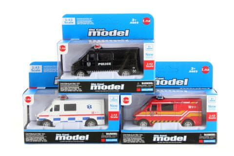 Kovinski modeli reševalnih avtomobilov. Velikost približno 9,5 × 4 cm. Dimenzije paketa približno 13,5 × 11 × 6 cm. Avtomobili se lahko prosto vozijo. Starost 3+