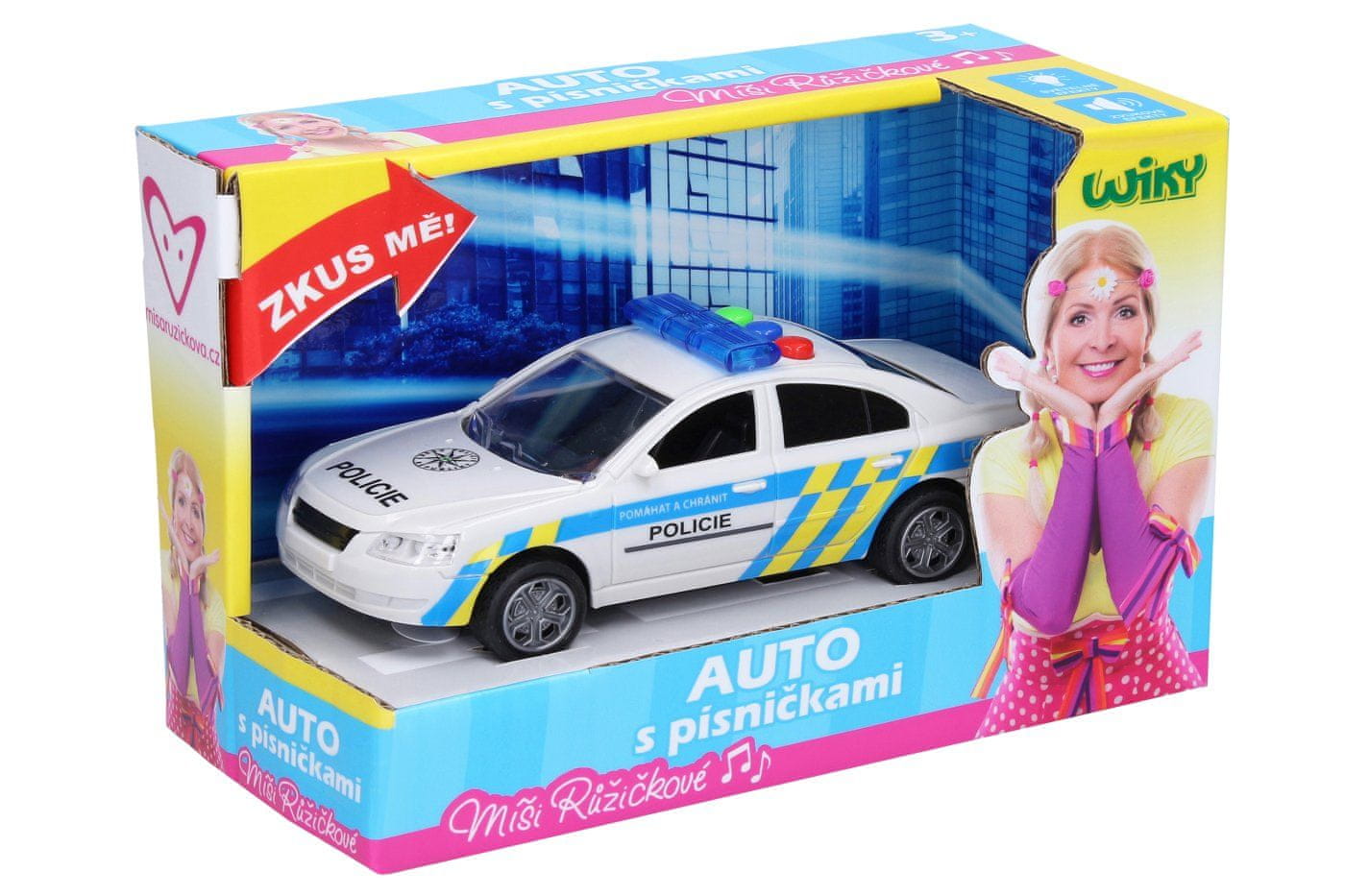 Policijski avto – Míša Růžičková. Velikost 15,5 cm. Na vztrajniku. Svetlobni in zvočni učinki, gumbi na strehi avtomobila 3 pesmi Miše Růžičkove – Policija, Ambulanta, Pepelnik. Vključene so baterije 3×AG13.