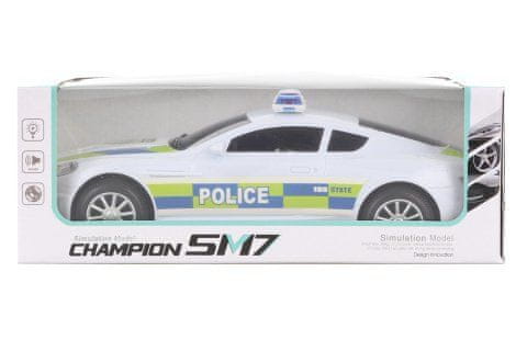 Plastični policijski avto na baterije meri približno 22,5 × 9,5 × 7,5 cm. Napajanje s 3× baterijami AA – niso vključene. Avtomobil vozi, ko je vklopljen, ob udarcu spremeni smer vožnje, sveti in oddaja zvoke. Dimenzije približno 23 × 8,5 × 10 cm. Starost 3+