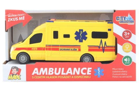 Odlična igrača za dečke in deklice je na Češkem zasnovan tovornjak Ambulance. Avto s pritiskom na gumb simulira klic med reševalno ekipo in dispečerjem. Dispečer: požar na glavni železniški postaji. Poročajo o zastrupitvi z dimom. Odzovejo se vse posadke na terenu. Kličemo dispečersko službo. Več žrtev. Pošljite več okrepitev. Uspelo nam je stabilizirati bolnika. Odpeljali ga bomo v bolnišnico. Vključuje delujoč svetilnik. Inercijski pogon. Avtomobil poganjajo 3× baterije AG13 (priložene). Velikost avtomobila približno 19 cm Primerno za otroke od 3. leta starosti