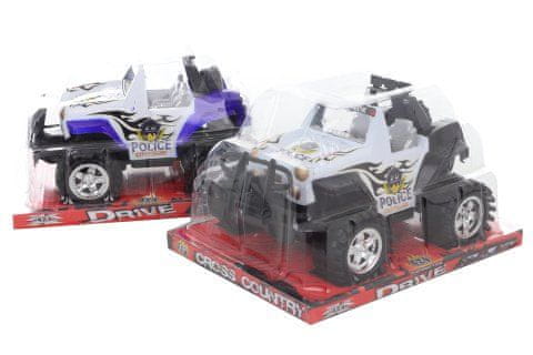 Plastični policijski terenski avto z vztrajnikom, velikost približno 18 × 13,5 × 11 cm. Dimenzije paketa približno 16,5 × 12 × 22 cm. Starost 3+