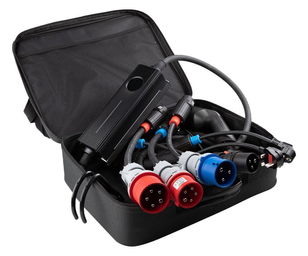 Priloženi so adapterji: SCHUKO, UK adapter, CEE črn 16A (enofazni), CEE rdeč 16A (trofazni), CEE moder 32A (enofazni) in CEE rdeč 32A (trofazni).