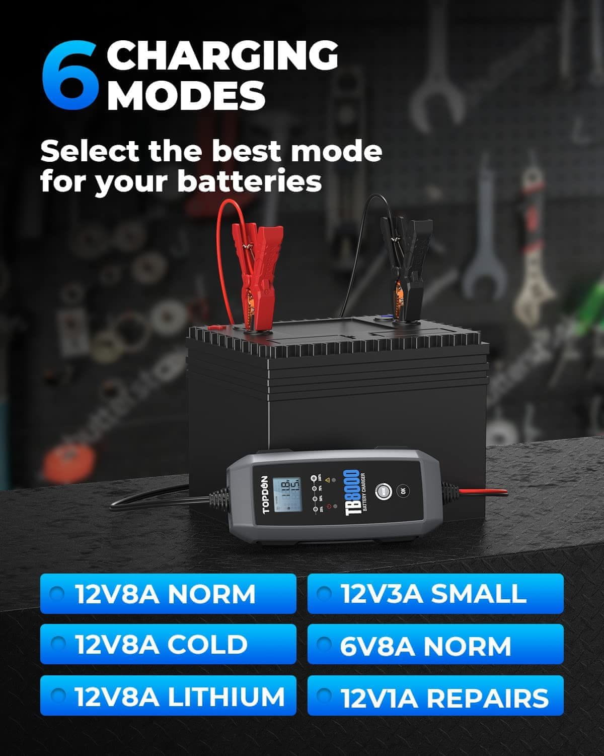 Polnilec akumulatorjev TOPDON TB8000 ponuja dva polnilna tokova 8A in 3A za akumulatorje od 15Ah do 260Ah. S tem edinstvenim orodjem boste lahko polnili akumulatorje v avtomobilih, motociklih, jahtah, tovornjakih, SUV-jih, MPV-jih, traktorjih in številnih drugih. S šestimi načini polnjenja: 12V/8A normalni, 12V/8A hladni, 12V/8A litijev, 12V/3A mali normalni, 6V/8A normalni in 12V popravni, lahko izberete tistega, ki najbolj ustreza vašim potrebam!