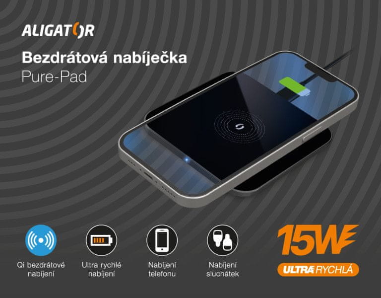 Kako deluje brezžično polnjenje? Tehnologija Qi Tehnologija Qi za prenos energije uporablja elektromagnetno polje s prilagodljivim nadzorom moči. Tako je polnjenje telefona ali slušalk varno in enostavno. Aligator Pure-Pad omogoča brezžično polnjenje sodobnih telefonov z močjo do 15 W, kar je 6-krat več kot pri osnovnem polnilniku USB!