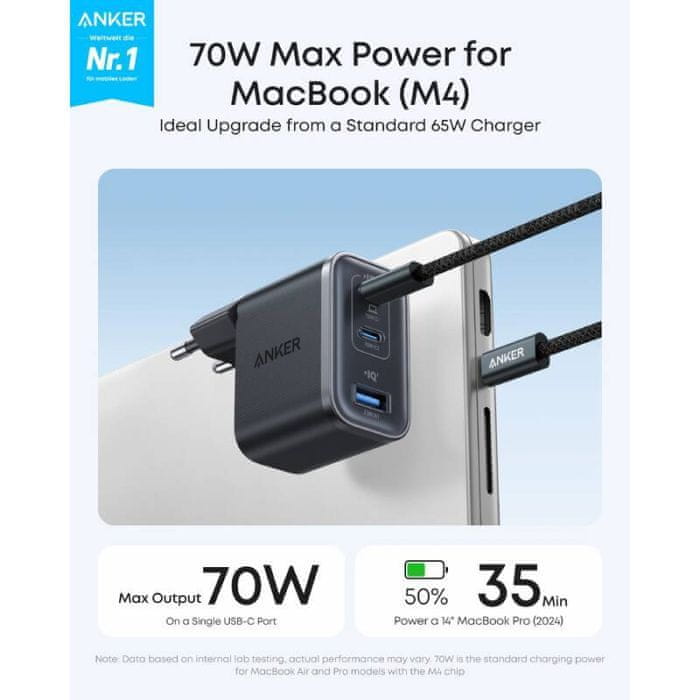 Napajajte svoj MacBook z resnično močjo 70 W: Vsak USB-C priključek zagotavlja do 70 W moči — dovolj za polnjenje 14-palčnega MacBook Pro (2024) od 0 do 50 % v 35 minutah. V primerjavi s standardnim 65 W polnilnikom omogoča hitrejše delovanje in boljšo združljivost z najnovejšimi modeli M4.