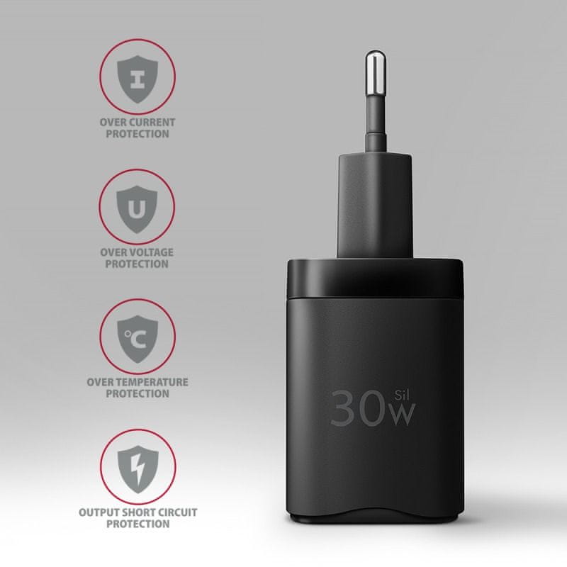 Kompaktni omrežni polnilnik USB AXAGON ACU-PD30 Sil za hitro polnjenje mobilnih naprav. Z največjo močjo 30 W polnilec polni telefone, tablične računalnike in druge mobilne naprave z največjo možno hitrostjo. Napajalnik ponuja obojestranski priključek USB-C.Kompaktna velikost in visoka zmogljivost sta posledica uporabljene nove tehnologije Sil. Super Silicij uporablja napredne materiale na osnovi silicija. To polnilniku omogoča, da doseže manjšo velikost, hkrati pa zagotavlja varno, stabilno in hitro polnjenje. Učinkovitost je tako enaka tehnologiji GaN, hkrati pa ohranja dostopno ceno. Polnilec je opremljen z izhodom Power Delivery 3.0 / Quick Charge 4+ USB Type-C, ki omogoča hitro polnjenje pametnih telefonov in tabličnih računalnikov z močjo do 30 W.Polnilec podpira 20W PD polnjenje za iPhone 12, 13, 14 in 15 ter ponuja tudi 27W PD polnjenje za iPhone 13 Pro, 14 Pro, 15 Pro in njihove modele Pro Max. Poleg tega podpira 25W SFC polnjenje za telefone Samsung Galaxy S20 – S24, Note in serije Z Fold, ponuja pa tudi 30W SFC polnjenje za telefone Samsung Galaxy S20 – S24 Ultra, Tab S7+ – S9+, Tab S8 – S9 Ultra. Adapter je združljiv tudi z drugimi standardi hitrega polnjenja telefonov, kot so Apple iPhone, iPad, Samsung, Huawei, Honor, Xiaomi. Napreden zaščitni sistem na izhodu polnilnega adapterja ščiti napolnjeno napravo pred poškodbami. Funkcija polnilnika zagotavlja tudi prepoznavanje polnjene naprave ter izbiro optimalne hitrosti in poteka polnjenja. Ohišje napajalnika je prijetne oblike in kompaktne velikosti. V primerjavi z običajnimi polnilnimi adapterji enakih parametrov je velikost polnilnika do tretjine manjša. Zaradi kombinacije majhne velikosti, dosežene s tehnologijo Sil, širokega razpona vhodne napetosti in univerzalnih izhodnih možnosti je polnilec idealen potovalni spremljevalec.