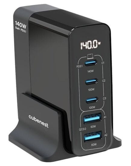 CubeNest S5D0 GaN Adapter 140 W (3 × USB-C do 140 W, 2 × USB-A do 60 W), PD 3.1, prenapetostna in prenizkonapetostna zaščita, zaslon