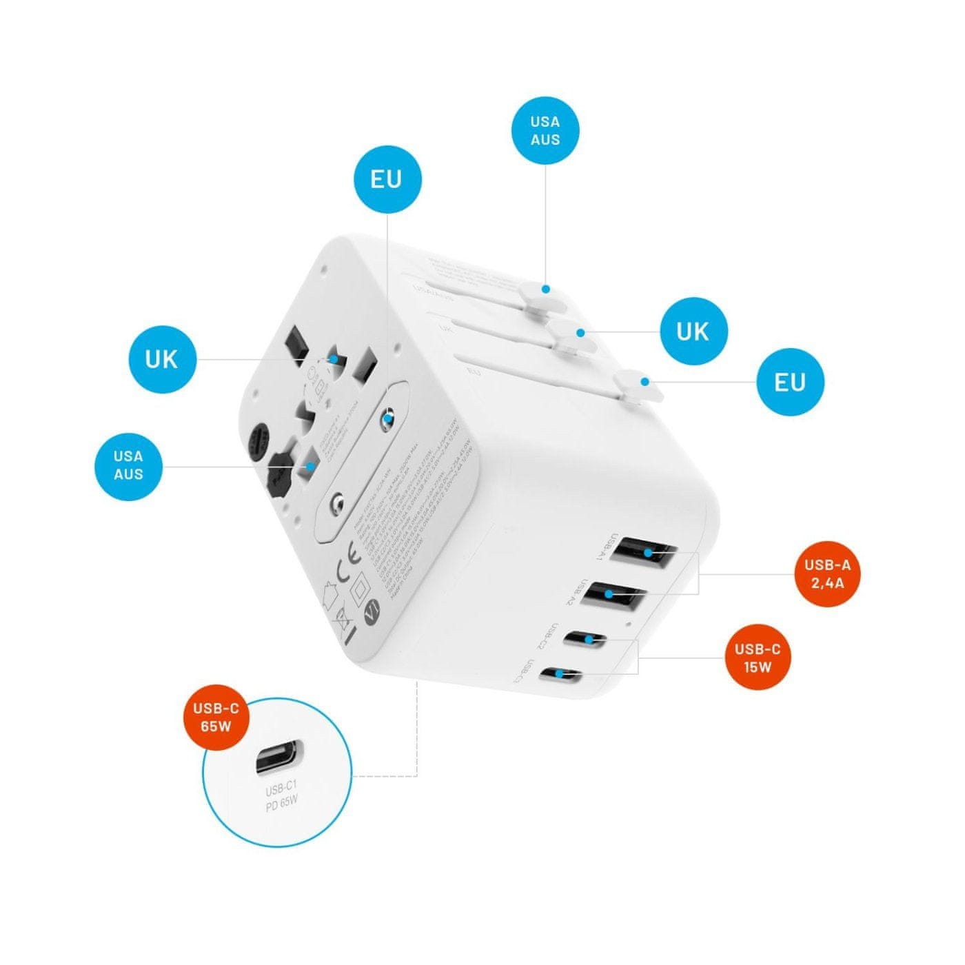 Kupili ste mobilni telefon, tablični računalnik ali drugo napravo v tuji državi in vtič ne ustreza vaši vtičnici? Uporabite univerzalni vhod na adapterju. Na njem boste našli tri priključke USB-C in dva priključka USB-A s skupno močjo 65 W.