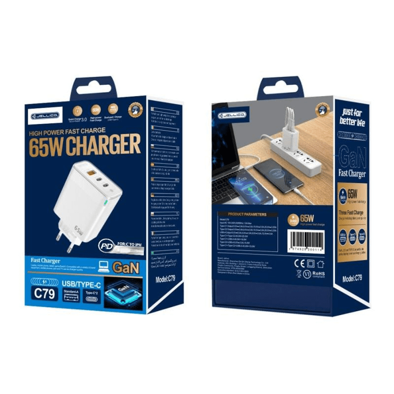 Jellico hišni polnilec adapter C79 220V Gun Quick Charge PD 65W vhod 1× USB A in 2× Type C – (s kablom Lightning- TypeC) 3.0 bel