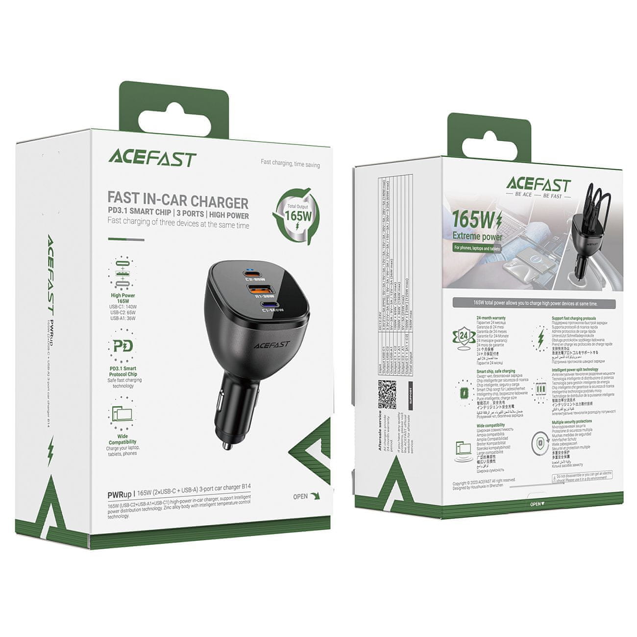 Avtopolnilec Acefast B14 z močjo do 165 W z 2 x USB-C in 1 x USB-A vhodom – črn